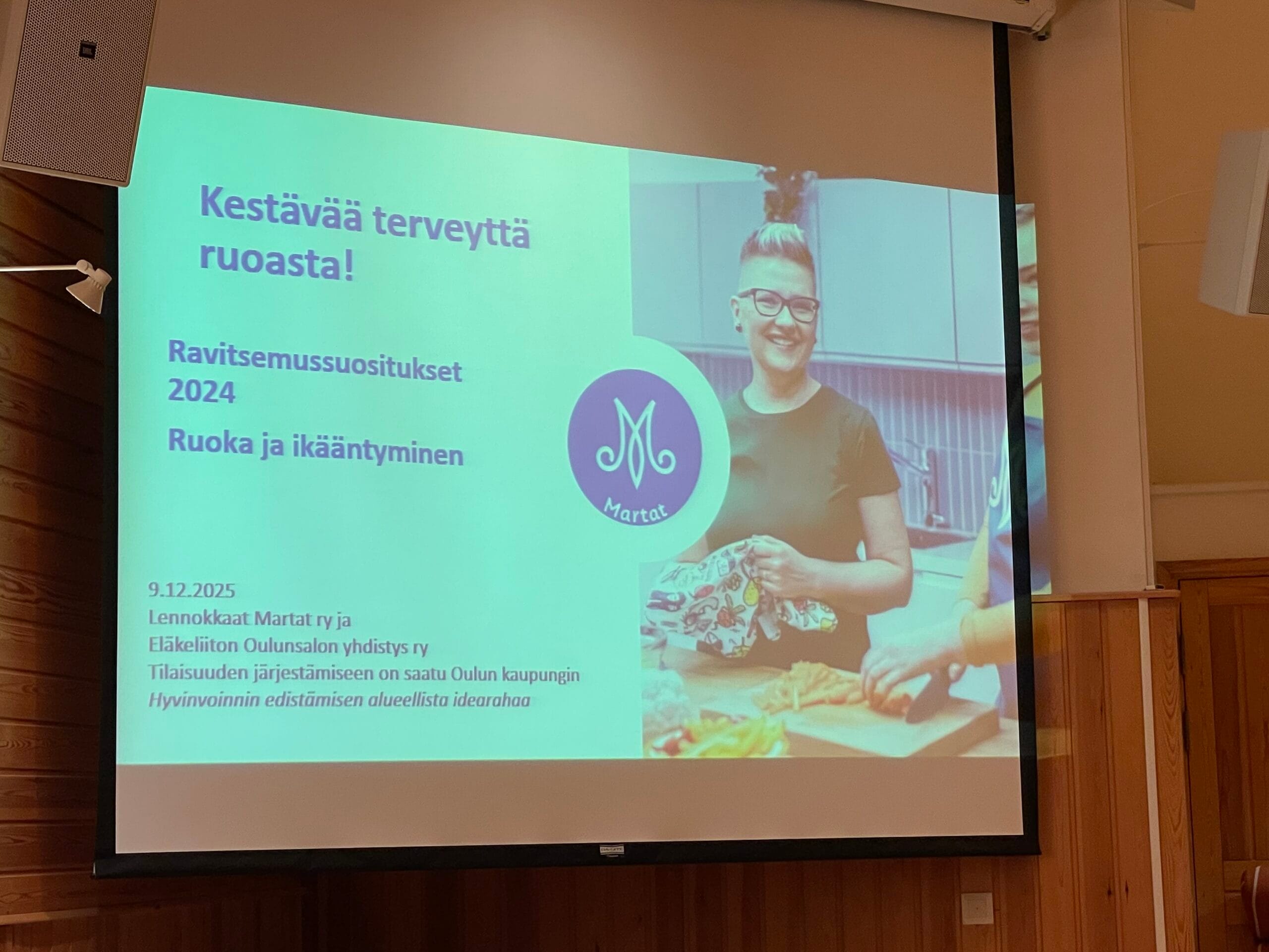 Yhdistyksemme ja Lennokkaiden Marttojen yhdessä järjestämä tilaisuus ikäihmisten ravitsemuksesta tiistaina 9.12. keräsi parikymmentä terveellisestä ruoasta kiinnostunutta kuulijaa Oulunsalon Kunnantalon valtuustosaliin.