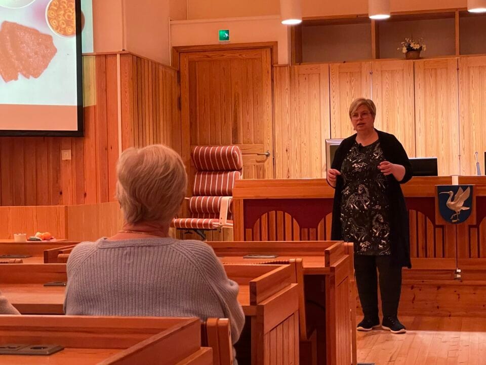 Marja Pussinen Martoista kertoi uusista ravitsemussuosituksista sekä siitä, mitä ikääntyessä tulee ottaa huomioon ruokailussa, esimerkiksi miten ikääntyminen vaikuttaa ruoan imeytymiseen.